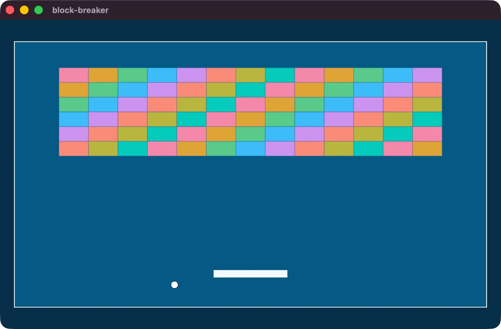 The interesting piece here is that we’re using the BRICK_SIZE and row and column counts to pick the position for each brick on screen. The x position is based around the center of the screen, while the y position is artificially elevated to the top of the play area.