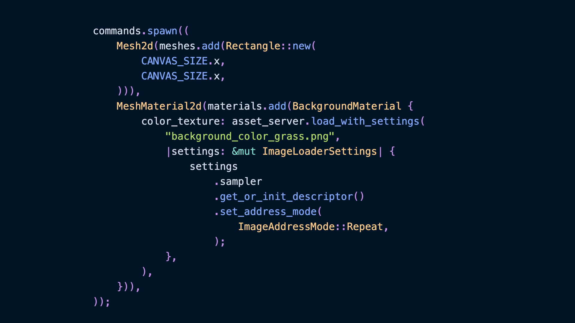 We’ll need a few new items in scope; Specifically ImageAddressMode, AsBindGroup, ShaderRef, ImageLoaderSettings, Material2d, and Material2dPlugin. Here’s our new use section: