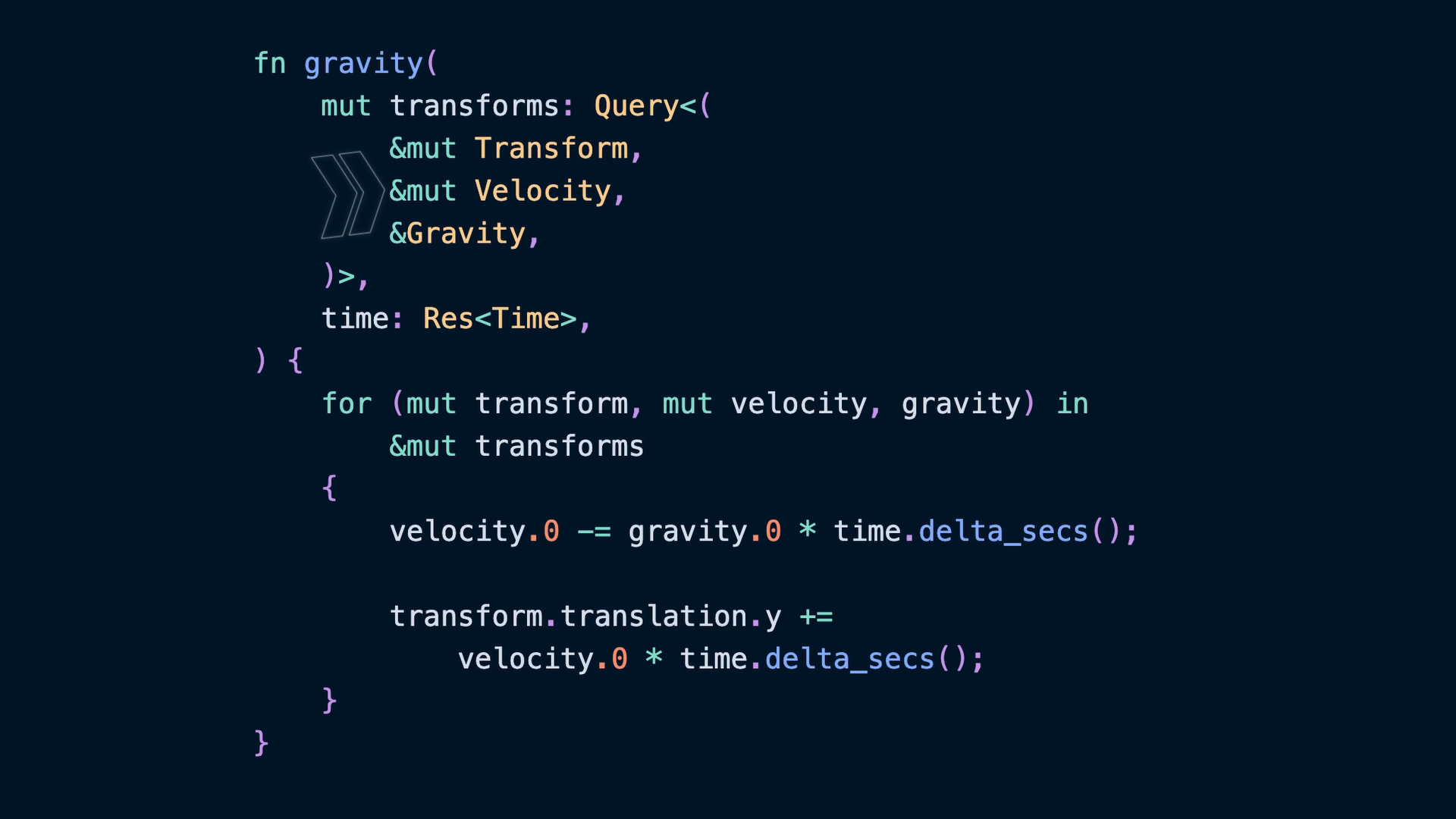 However, the mutability of the values is important! References (the &) are generally required, and those can be shared or exclusive references. Exclusive references are written as &mut and allow us to mutate the values of the components while shared references & only allow us to view the values. Since we’ll be mutating the components when we iterate over them, we’ll also need mut declarations in a few places. Especially including the &mut transforms that we’ll be iterating over.